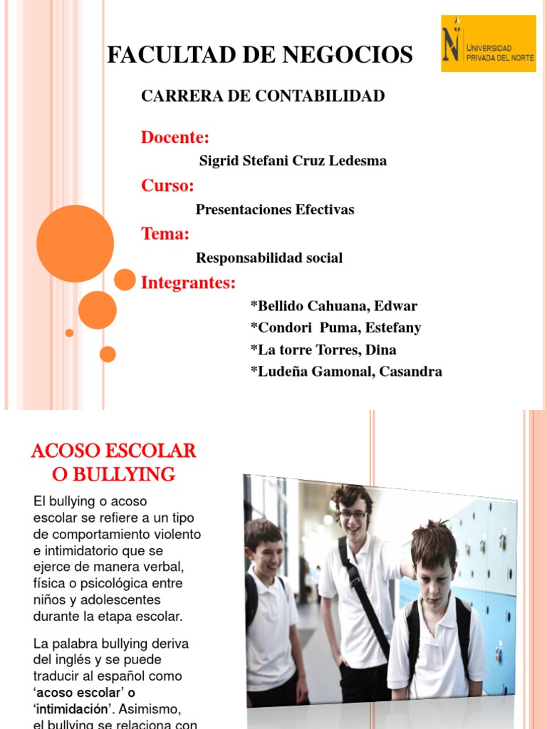 El acoso social, a menudo denominado como acoso en relaciones, consiste en dañar la reputación o las relaciones de una persona. Divulgar rumores acerca de una persona. Que lo disfruten.hecho por películas prankstar y greenstarkoopatroo. Las investigaciones demuestran que, con el tiempo, esta actitud puede detener el acoso. Get support & advice on bulling. Get support & advice on bulling. (m) the writer confessed to having been a victim of bullying in high school. Dejar a una persona de lado a propósito. Los padres, el personal educativo y otros adultos en la comunidad. Un video que muestra el problema del bullying en las escuelas. Learn how to help friends through tough times. (m) means that a noun is masculine. ¿qué tipos de bullying existen?